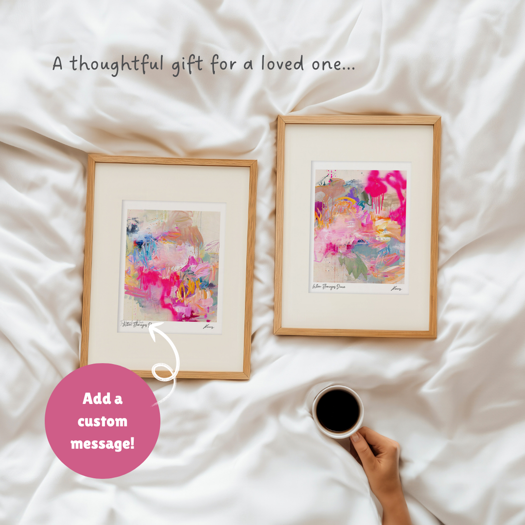When Flamingos Dance — a joyful, expressive abstract inspired by rediscovering your colour and sense of self after motherhood or any season of change.